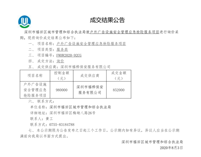 户外广告设施安全管理应急抢险服务项目成交结果公告