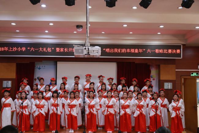 为了使少先队员体验集体合作的快乐, 5月31日上午,上沙小学在三楼阶梯教室举行了以“唱出我们的幸福童年”为主题的校园歌咏比赛。比赛中,孩子们依次演唱了精心排练的歌曲,“莫等闲、白了少年头,空悲切”、“母亲恩情似春晖,寸草何以报母恩?”……个个精神抖擞,歌声嘹亮,赢得了评委们的高度赞扬。