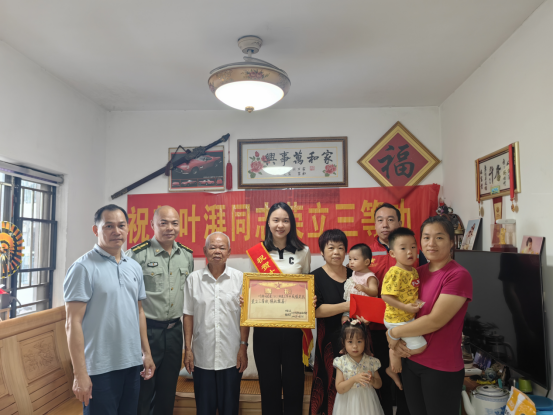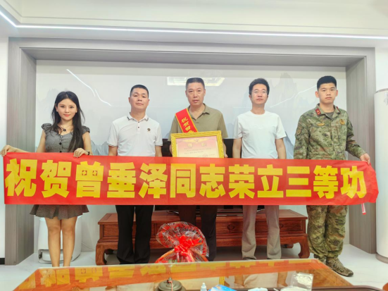 在得知来自福田区沙头街道的现役军人曾垂泽荣立三等功后,送喜报小组来到其家中,将这份沉甸甸的荣誉送到家属手上,并致以热烈的祝贺,感谢他们为国家、部队培养出新时代优秀军人,为家乡争得了荣誉。