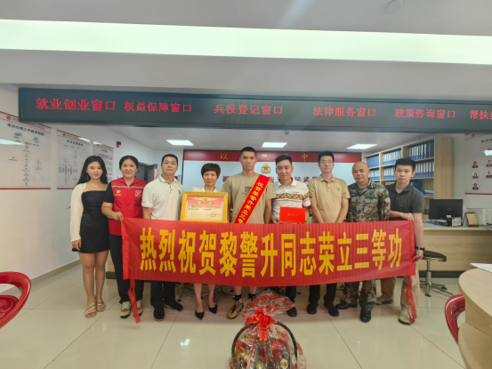 来自沙头街道的黎警升,是2023年3月继续服役于部队的一级士官。近日,黎警升在部队荣立三等功。送喜报小组一行来到沙头街道退役军人服务站,与服务站工作人员共同为黎警升送上喜报、绶带等,其父母共同参与本次活动。