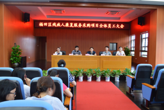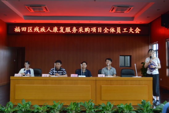 2017年5月4日下午,区残疾人综合服务中心在福康之家二楼多功能厅召开残疾人康复服务采购项目全体员工会议。参会的有区残疾人综合服务中心主任宋舒怀、深圳市南山区惠民综合服务社总干事周湧、副总干事陈鑫、人力资源部部长陈凤莲及该项目的全体工作人员。