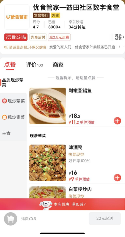 此外,该食堂还于今年6月开通了外卖服务,目前平台总销量已突破3000单,日均回头客近百人,成为辖区“云端助餐”的标杆。通过京东APP“秒送频道”下单,提供6荤6素每日更新、现炒现送的安心餐品,在平台与食堂双重补贴下,15元内即可选购到一份色香味全、科学搭配的套餐。“雨天、热天不用出门,手机点餐直接送到家,菜品也放心!”不少社区长者对社区食堂开通外卖服务赞不绝口。