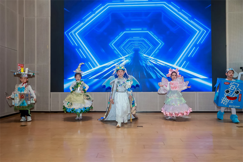 舞台区,福田区天健幼儿园萌娃带来的奶盒时装秀创意十足,用童真演绎环保理念;展览区,五大主题宣传展板全方位展示奶盒资源回收、再利用的完整链路,师生手工作品与环保再生产品错落陈列,让观众直观感受再生魅力;互动区,孩子们聚集在一起,用奶盒制作中国结迎接春节,通过非遗技艺将奶盒纸浆转化为精美再生纸画作,在动手实践中强化环保认知。