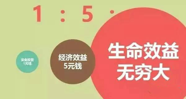 1:5:∞。即1元钱的安全投入,可创造5元钱的经济效益,创造出无穷大的生命效益。任何有效的安全投入(人力、物力、财力、精力等)都会产生巨大的有形和无形的效益。所以,在安全生产中,各级、各部门、各岗位就是要多重视、多投入,投入一分,回报无限。