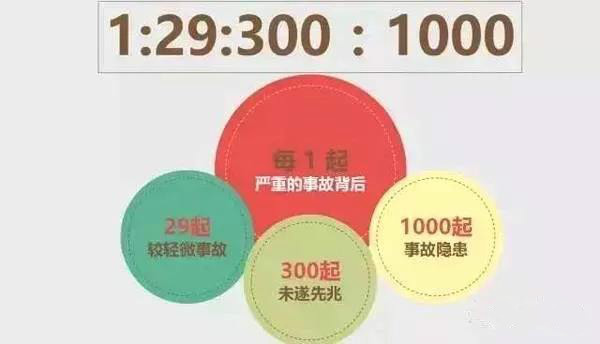 1:29:300:1000,每一起严重的事故背后,必然有29起较轻微事故和300起未遂先兆,以及1000起事故隐患相随。所以,在安全管理工作中,排除身边人的不安全行为、物的不安全状态等各种隐患是首要任务,隐患排查要做到预知,隐患整改要做到预控,从而消除一切不安全因素,确保不发生事故。