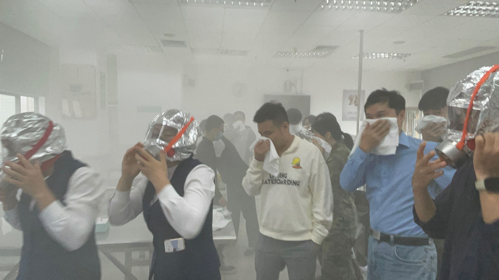 在现场消防演练环节,针对厨房失火可能导致发生的各种应急处置情景,分别设置了厨房应急小组、食堂疏散小组、物业救援小组,通过初期灭火处置、受伤人员救治、快速佩戴防毒面具、根据火情扩大及时调整疏散线路以及拨打119、120电话等措施同步开展应急处置行动,切实提高国防大厦管理办后勤工作人员面对厨房火情的应急处置水平,增强干部职工的逃生疏散意识和能力。