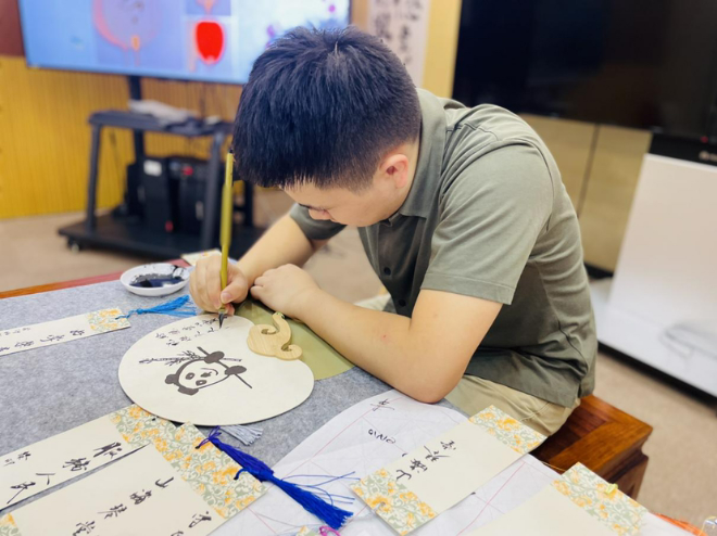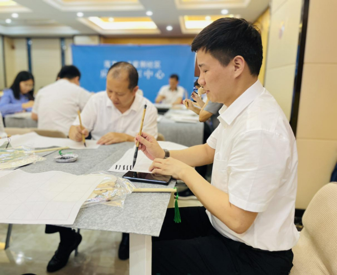 在创作之余,深圳市山海琴堂文化传播有限公司为大家送来了美味的甜点、水果、饮料等各种美食,大家边吃边聊,一起乐享这份惊喜与福利,在放松心情的同时,也收获了友谊与文化。活动最后,大家高兴地举起自己的作品合影留念。“这是一次难得的中国文化体验,感受到了中华文化的博大精深,也增强了学习书法的兴趣”。大家纷纷表示,要把深厚的爱国情怀转化为坚定的理想信念和奋发有为的实际行动。