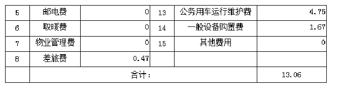 2016年度,区总工会机关运行经费支出13.06万元,比2015年决算数同口径减少2.05万元,降低15.7%。主要原因是认真贯彻执行中央八项规定精神,厉行节约,压缩经费支出。2016年度机关运行经费具体明细如下: