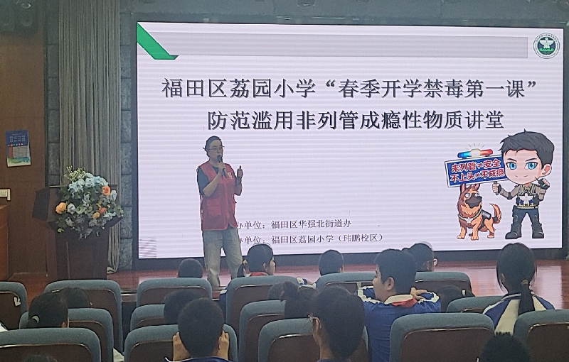 为进一步深化青少年毒品预防教育工作,切实增强学生对非列管成瘾性物质的防范与辨别能力,3月9日下午,福田区华强北街道办事处在荔园小学(玮鹏校区)开展“春季开学禁毒第一课”专题宣讲活动,重点围绕防范非列管成瘾性物质滥用进行科普教育。