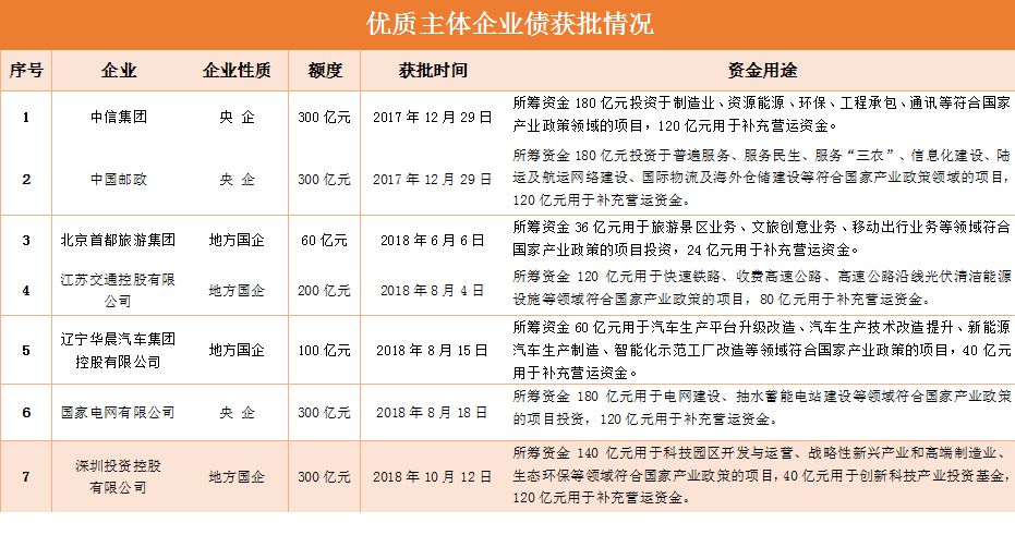 截至2018年10月15日,已获批的“先核准债券规模、后备案项目发行”的“优质主体企业债券”共7家,总金额为1560亿元。发行人均为主体评级AAA的大型央企或国企。反映国家发改委目前对优质主体的认定为国有的大型AAA级企业集团,业务范围为国家鼓励的产业方向。