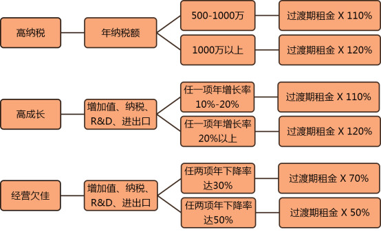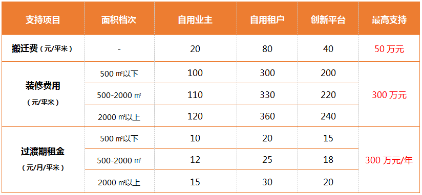 《政策》将支持对象分为自用业主、自用租户和创新平台三类主体;参考一般开发商的做法,采取搬迁费、临时办公场所装修费和过渡期租金三类支持方式,再按照企业实际办公面积大小设定 <500平米、500-2000平米、>2000平米三个支持基准,最终实现分级分类支持,具体如下: