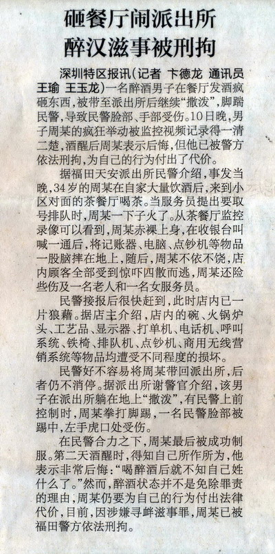砸餐厅闹派出所 醉汉滋事被刑拘——《深圳特区报》2015.5.12 A14版