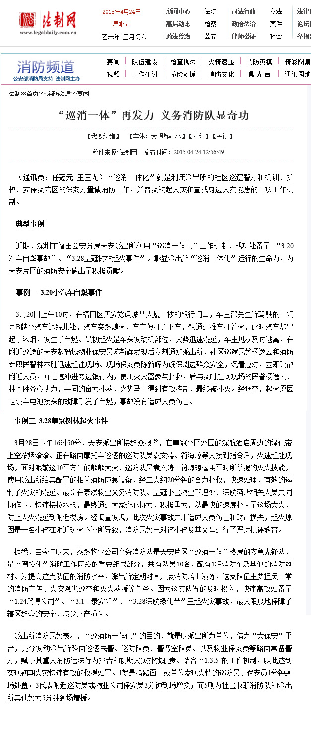 巡消一体再发力 义务消防队显奇功——《法制网》2015.4.24 消防要闻