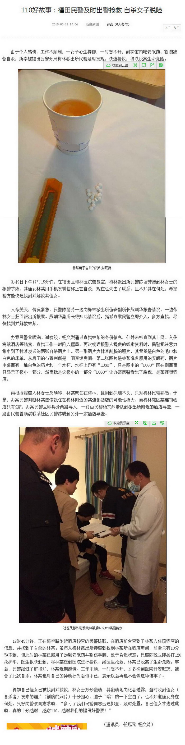 110好故事:福田民警及时出警抢救自杀女子脱险——《新浪网》2015.3.13