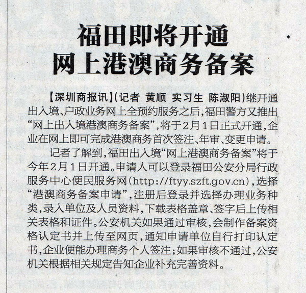 福田即将开通网上港澳商务备案——《深圳商报》2015.1.30 B03版