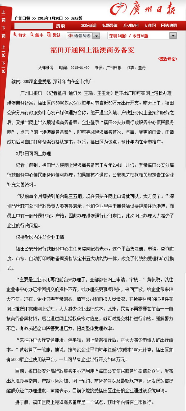 福田开通网上港澳商务备案——《广州日报》2015.1.30