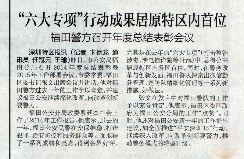“六大专项”行动成果居原特区内首位——2015.1.20 A3版《深圳特区报》