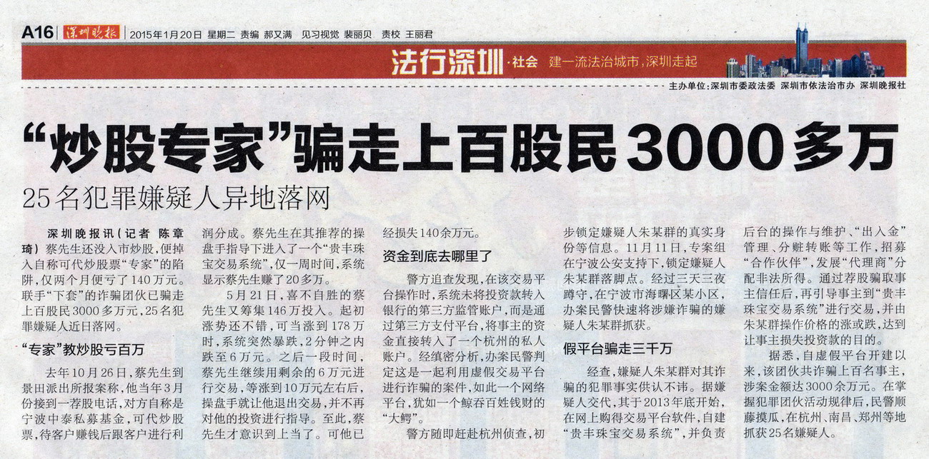 “炒股专家”骗走上百股民3000多万——2015.1.20 A16版《深圳晚报》