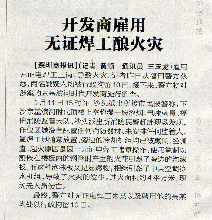 开发商雇用无证焊工酿火灾——2015.1.13 B04版《深圳商报》