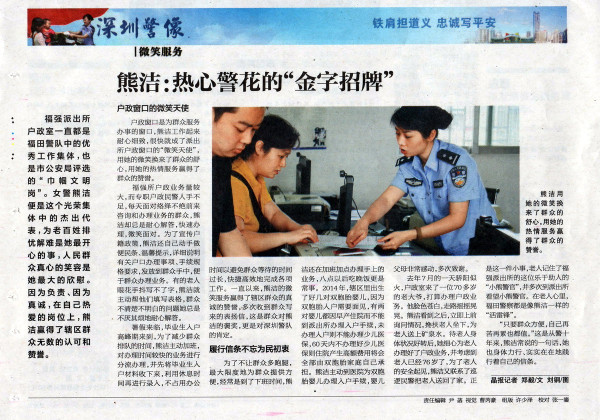 熊洁:热心警花的“金字招牌”——2015.1.7 A18版《晶报》