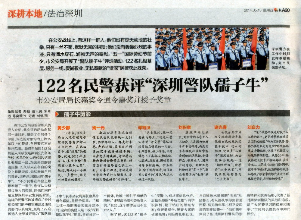 122名民警获评“深圳警队孺子牛”——《晶报》2014.5.15 A20版