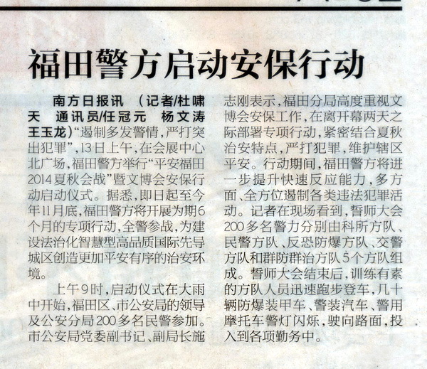 福田警方启动安保行动——《南方日报》2014.5.14 AII02版