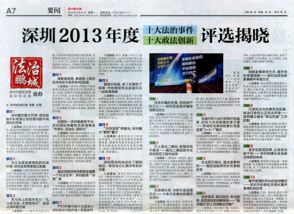 深圳2013年度十大法治事件、十大政法创新评选揭晓——《深圳特区报》2014.3.31 A7版