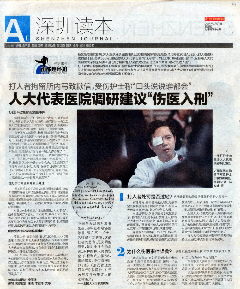 人大代表医院调研建议“伤医入刑”——《南方都市报》2014.2.27 AII01版