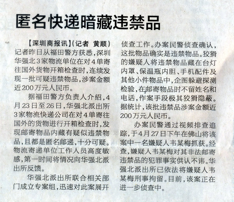 匿名快递暗藏违禁品——《深圳商报》2014.5.1 A05版