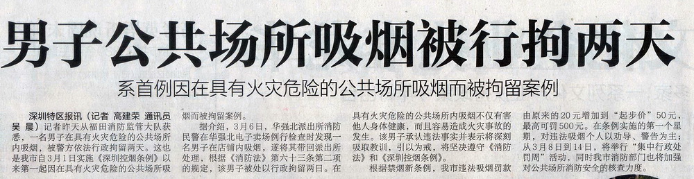 男子公共场所吸烟被刑拘两天——《深圳特区报》2014.3.7 A16版
