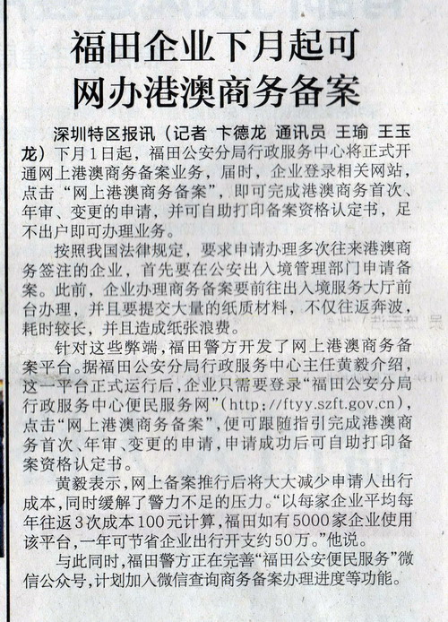 福田企业下月起可网办港澳商务备案——《深圳特区报》2015.1.30 A7版