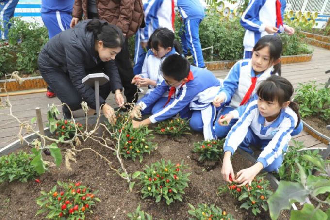 为了解决劳动教育场地问题,学校把教学楼顶空间改造成天台生态农场,同学们可以开展劳动、观察研究、种植和收获等活动。生态农场里有瓜果园、水稻园、蔬菜园,常年种植的植物种类在30种以上。