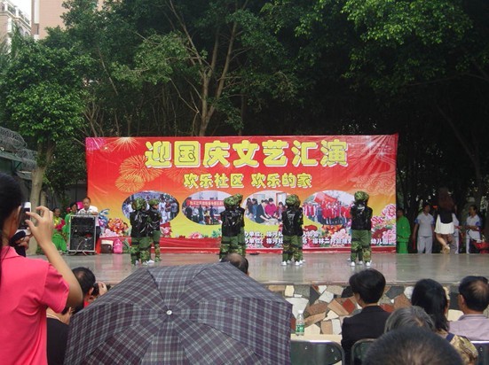 在国庆节来临之际,梅河社区老年协会于2013年9月27日下午在梅林二村广场开展以“欢乐社区 欢乐的家”为主题的迎国庆大型文艺汇演活动。参加演出的有老年协会会员、梅林幼儿园、梅林二村管理处等,共表演节目11个,活动中台上台下互动环节2个,活动现场,精彩的表演及互动环节吸引了数百名群众顶着烈日观看,现场不时响起热烈掌声与喝彩声。这次的迎国庆文艺汇演活动表达了大家对祖国的热爱和敬仰之情,同时深受广大居民的欢迎。