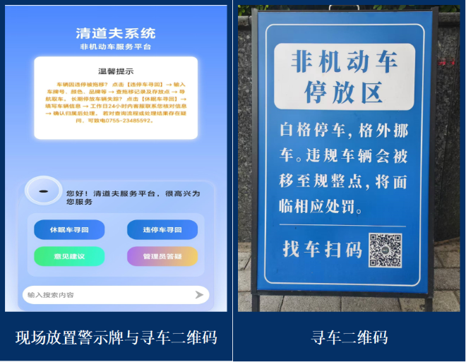 南园街道自主开发“清道夫”小程序,形成“发现—录入—查询—找回”的全流程管理机制,累计处理违停非机动车10128辆、市民车辆找回率保持100%,清理休眠车1000余辆。同时,工作人员自制便携挪车工具,实现单人即可安全挪动车辆,显著提升现场处置效率。