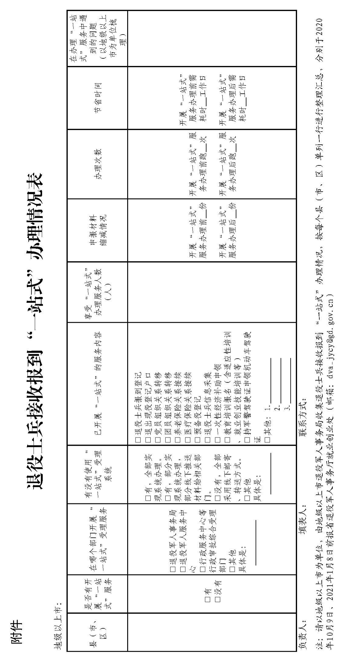 为深入贯彻习近平总书记关于退役军人工作重要论述精神,贯彻落实党中央、国务院关于精简审批、优化服务的决策部署,按照我省关于加强新时代退役军人工作的若干措施要求以及《广东省2020年政务服务优化工作要点》要求,现就开展广东省退役士兵接收报到“一站式”办理工作提出以下意见。