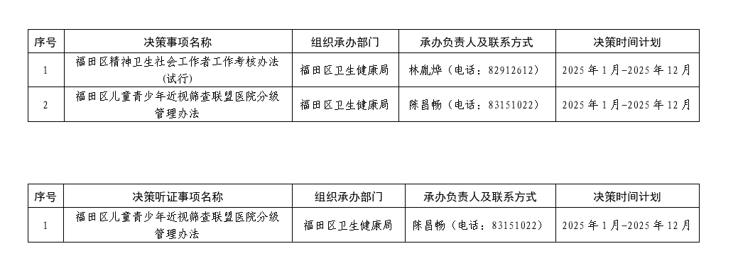 福田区卫生健康局2025年度重大行政决策事项目录(调整后)