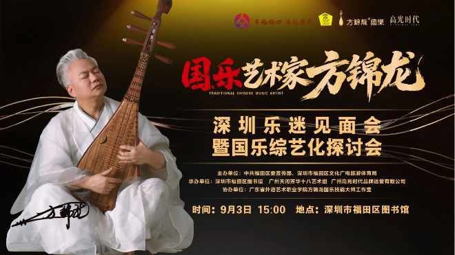 9月3日15:00,方锦龙将空降福田区图书馆,带来深圳乐迷见面会暨国乐综艺化探讨会,为第九届“方锦龙·深圳(福田)民族民间音乐周”拉开精彩序章!
