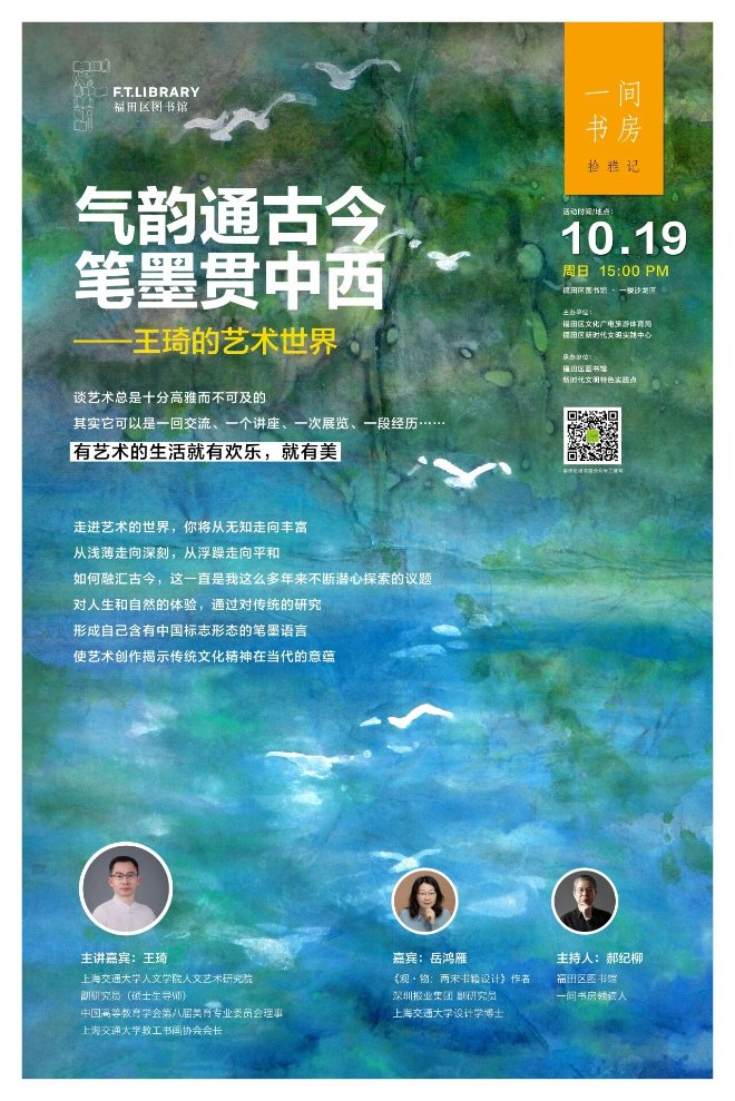 主讲嘉宾:王琦,上海交通大学人文学院人文艺术研究院副研究员(硕士生导师)、中国高等教育学会第八届美育专业委员会理事、上海交通大学教工书画协会会长。岳鸿雁,《观·物:两宋书籍设计》作者、深圳报业集团副研究员、上海交通大学设计学博士。郝纪柳,福田区图书馆一间书房领读人。