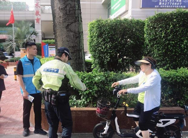 6月21日,根据《福田区开展骑行电动车头盔佩戴专项行动方案》工作要求,持续推进骑行电动自行车佩戴头盔提升行动,不断增强骑行人员交通安全意识,园岭街道联合上步交警中队前往辖区上步百花一路路口、国城花园、核电花园等场所开展值守劝导工作,重点对骑乘电动自行车未佩戴头盔进行劝导,本次行动共出动5人次,警告违法行为46宗,查处电动车违法行为12宗,派发宣传资料100余份。