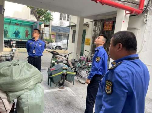 根据“包路进楼联户”工作要求,一中队负责人郑金凯、副中队长宋勇带队下沉红荔社区网格:检查园岭新村67、68栋及周边环境卫生,清理乱堆放、规整乱停放非机动车,发现的问题均当场解决处理。