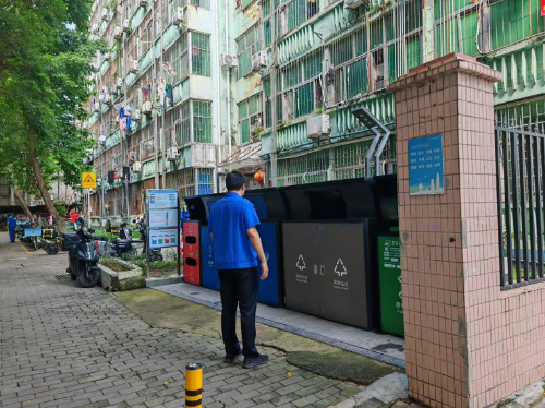 9月27日上午、市容中队联合南天社区与国城花园管理处、业主代表现场沟通协调垃圾分类再生资源智能回收箱移位换点事宜。