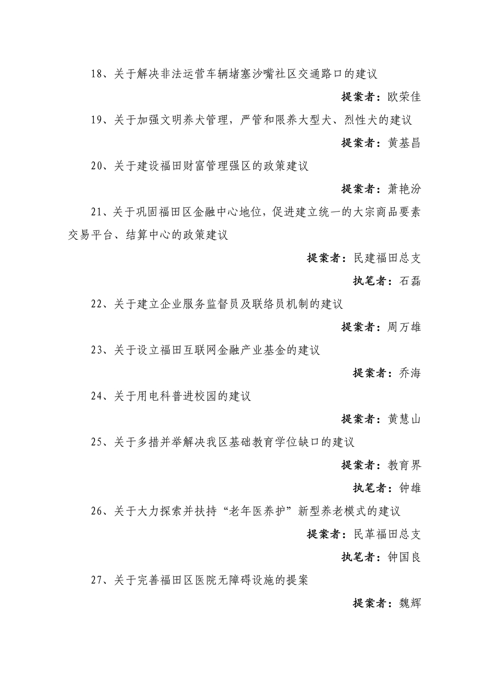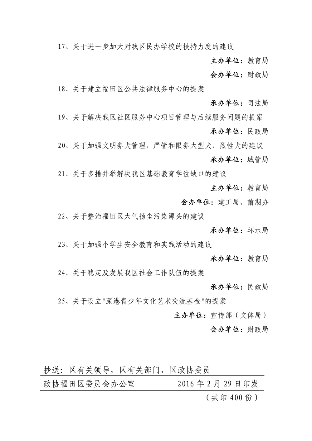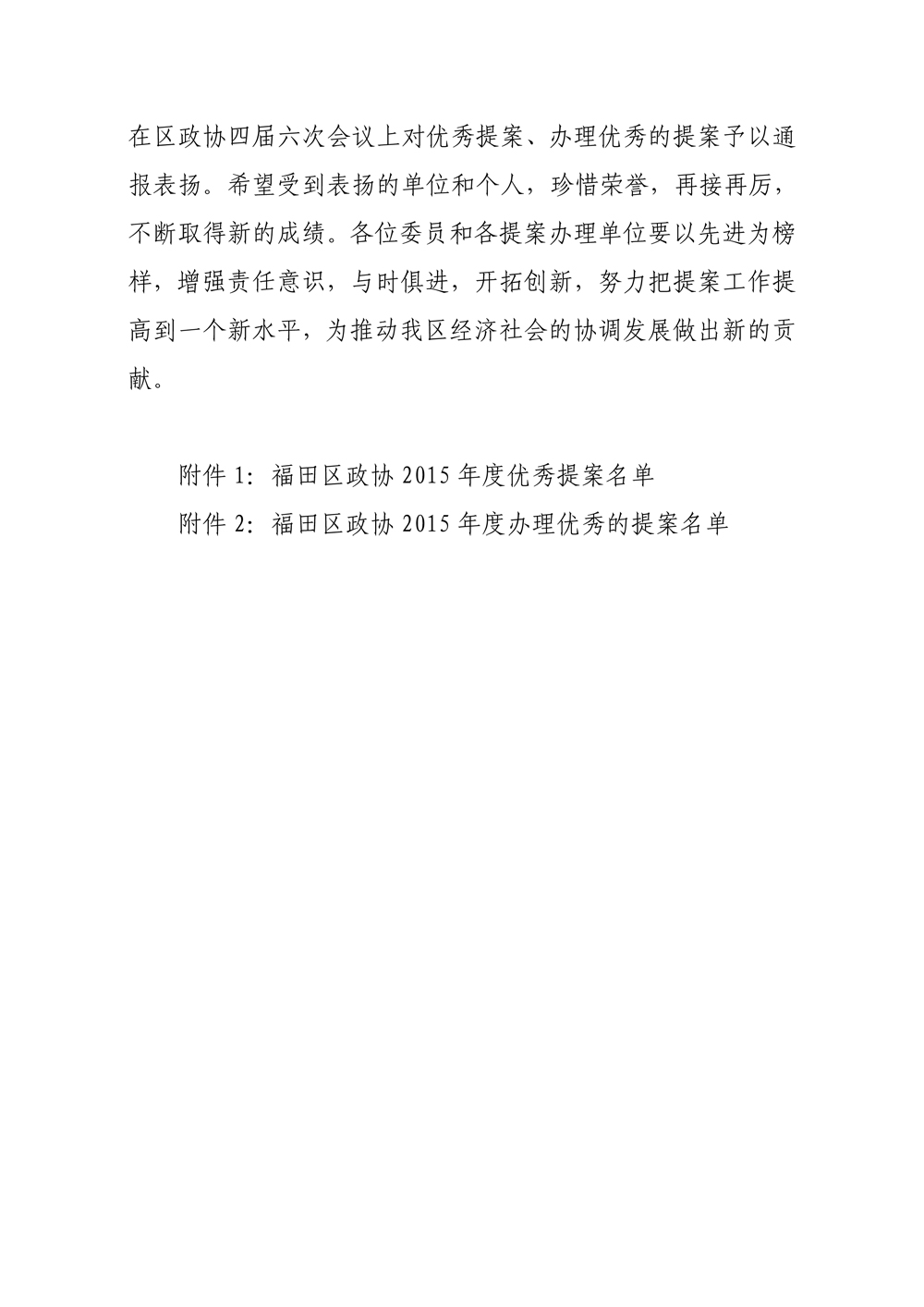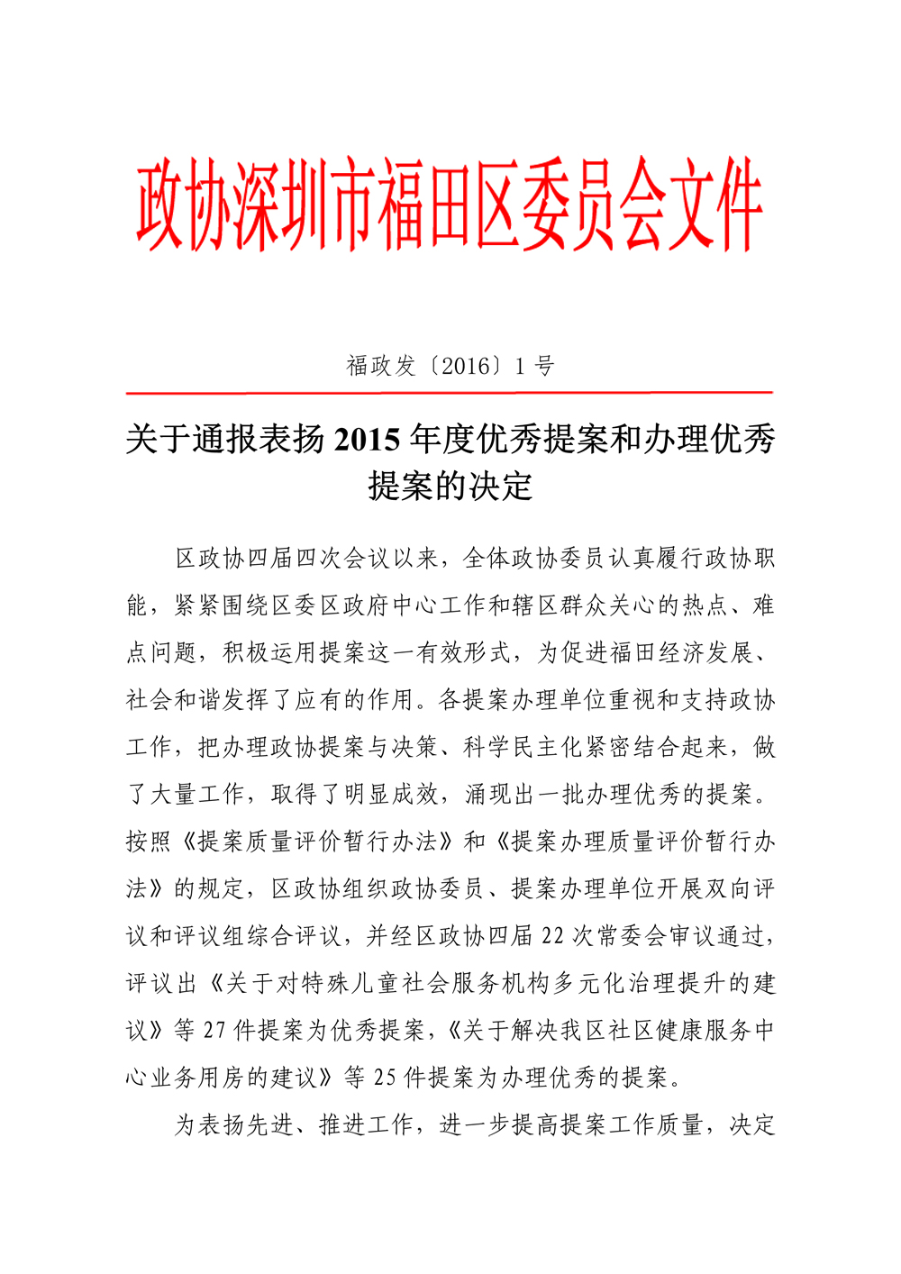 政协福田区四届六次会议,通报表扬了27件优秀提案和25件办理优秀的提案。区政协副主席杨毅宣读了《关于通报表扬2015年度优秀提案和办理优秀提案的决定》。