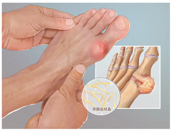 尿酸高产生的尿酸盐结晶大量沉积在关节腔内,可引发痛风性关节炎,导致关节红肿、疼痛、变形等。