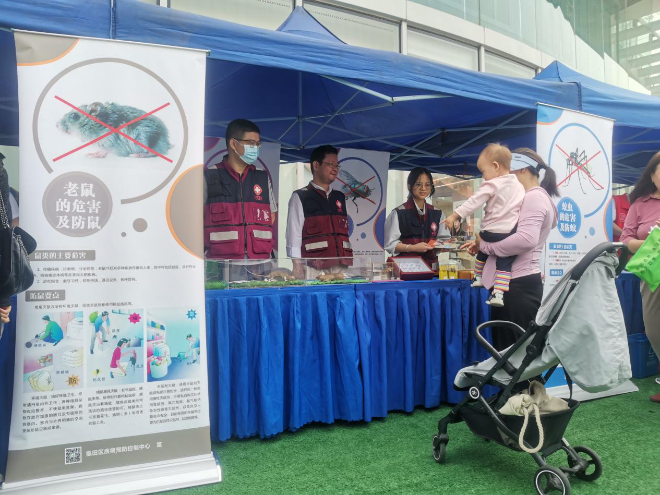 为弘扬爱国卫生运动优良传统,充分动员广大居民践行文明健康绿色环保生活方式,进一步营造爱国卫生人人参与的浓厚氛围,4月11日上午,福田区爱国卫生运动委员会、福田区卫生健康局启动2023年“爱国卫生月”暨“清洁深圳月”宣传活动,本次活动以“宜居靓家园,健康新生活”为主题,福田疾控中心在活动现场设置摊点参与病媒生物防制相关知识宣传。