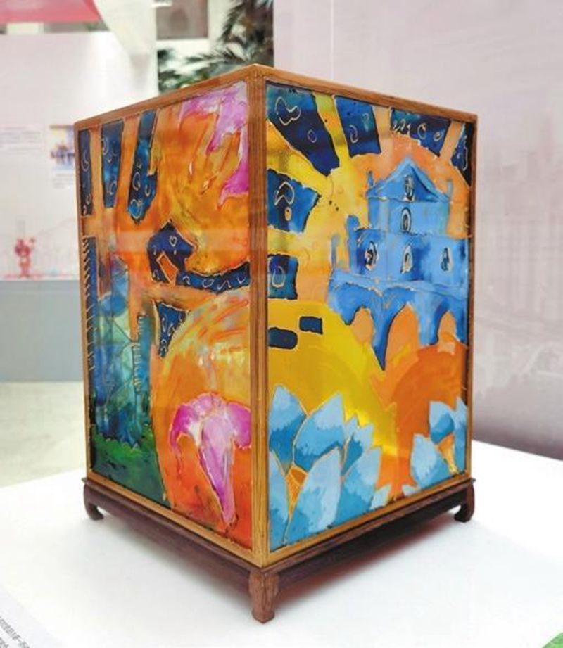 A colored glass lamp designed and crafted by Shenzhen Hong Kong Pui Kiu College Longhua Xinyi School students. The lamp’s pattern is inspired by Shenzhen, Hong Kong and Macao landmarks.
