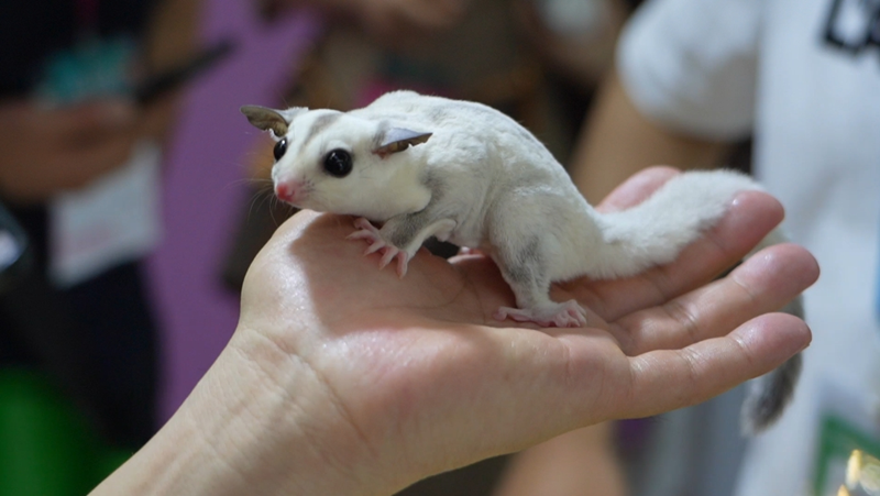 A pet sugar glider on display at the fair. Sugar gliders are a tiny marsupial that can glide through the air by using skin flaps between their legs.