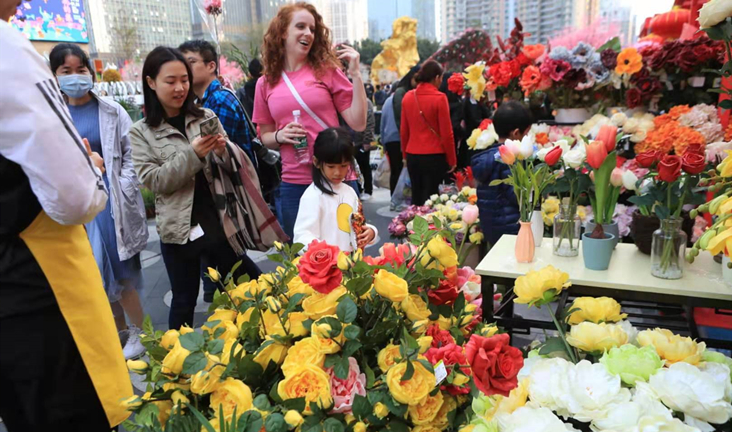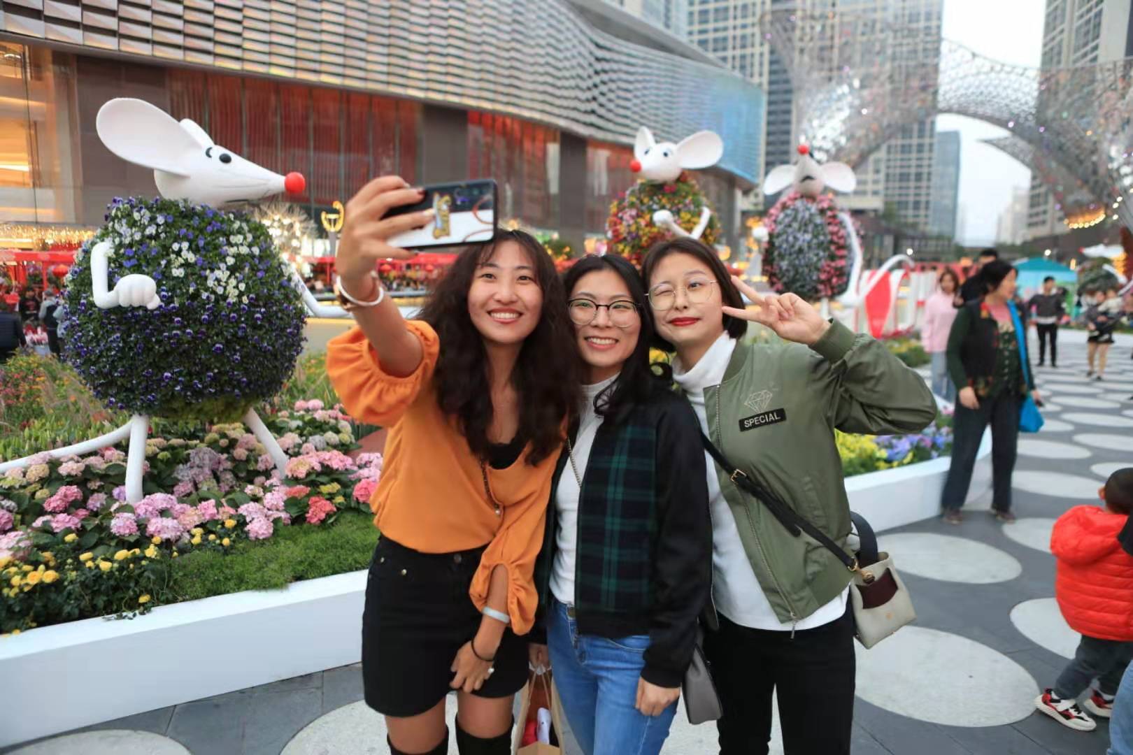 Vistors enjoy flowers at the pedestrian street outside One Palace, a large-scale commercial facility in Futian District, during the 2020 Shenzhen Spring Festival Flower Fair yesterday. The fair will wrap up Friday, the Lunar New Year’s Eve. Photos by Sun Yuchen