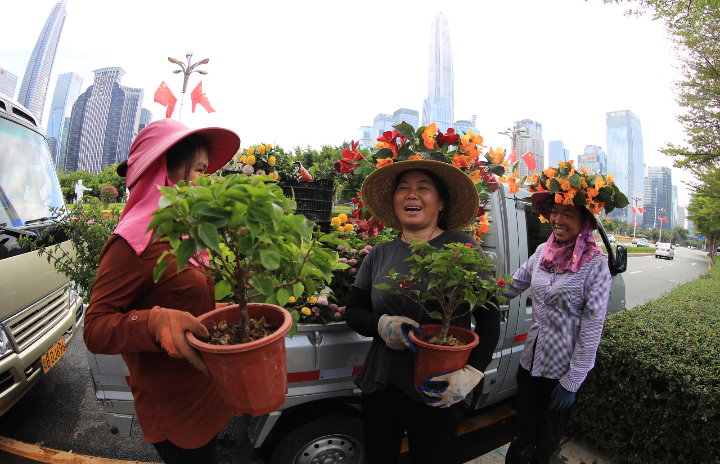 Main streets in Shenzhen have been decorated brilliantly with colorful flowers and national flags to celebrate the upcoming National Day and Mid-Autumn Festival holiday.
