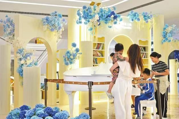 Visitantes son atraídos por elementos culturales como libros y un piano de cola, añadiendo un toque de sofisticación a la experiencia del centro comercial.