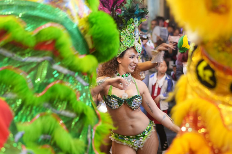 Un vibrante desfile, coreografiado especialmente para fusionar la samba brasileña con la danza del león chino, dio vida al Bloque Cultural 1368 de Shuiwei en el distrito de Futian el sábado por la noche.